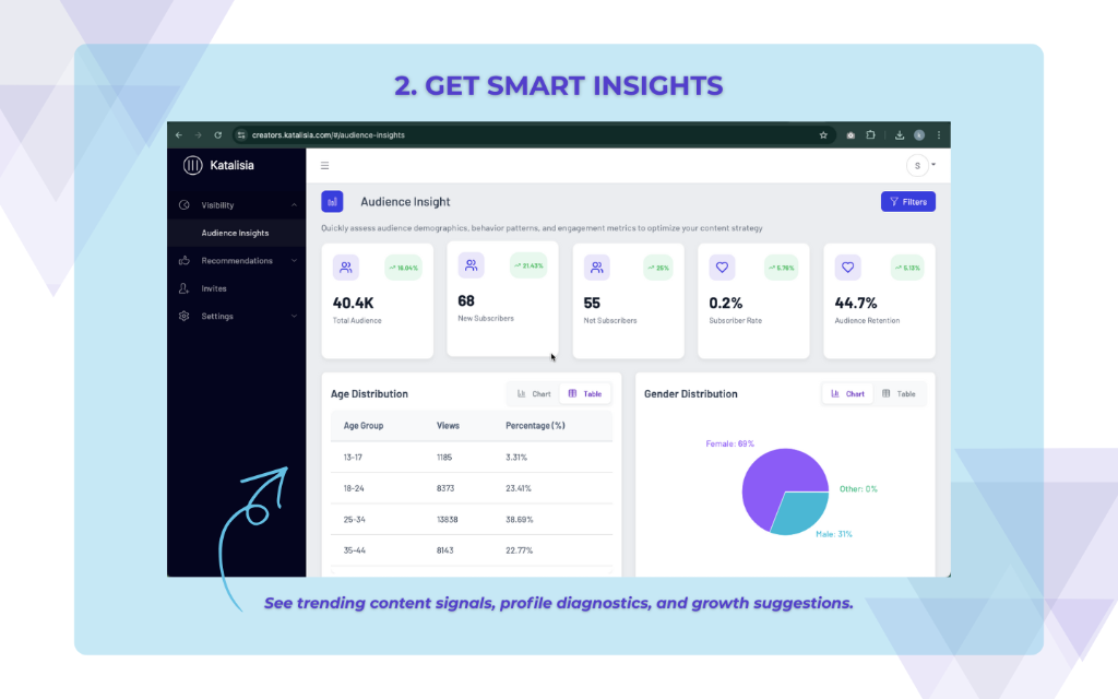 Connect your social media profiles securely via platform OAuth in minutes. Katalisia instantly ingests your analytics: views, watch time, engagement, demographics, and traffic sources – providing a holistic view of your performance.
