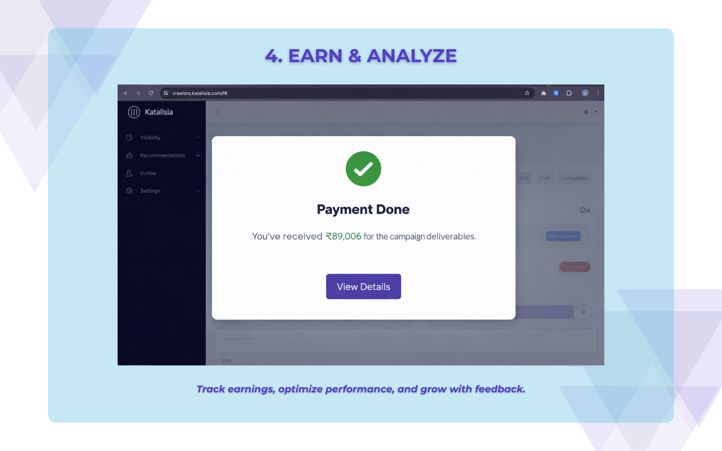 Katalisia intelligently matches you with relevant brands. Get 'Smart Invites' via email and your dashboard for campaigns tailored to your audience and content style. Upon acceptance, our platform guides you through the collaboration workflow.